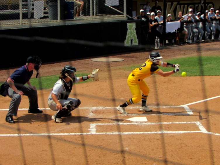 Bunting is not a technique used that much anymore in baseball. It’s still a big deal in softball, however. In this next photo, a Shockers hitter is showing the fans how it’s done.